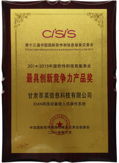2015年6月16日晚,第十三届中国国际软件和信息服务交易会“2014-2015中国软件和信息服务业年度发布会”在大连世博广场隆重举行,此次发布会共评出9项大奖,我公司自主研发的EMN网络设备嵌入式操作系统荣获“2014-2015中国软件和信息服务业最具创新竞争力产品奖”。